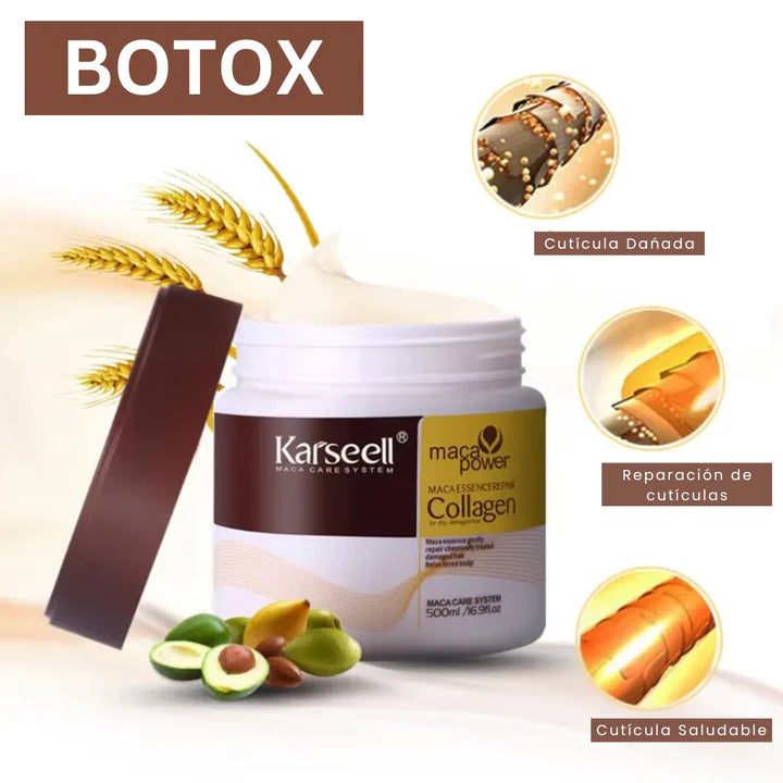 Di adiós al cabello seco y quebradizo. El Combo Karseell: Botox + Shampoo + Argan revitaliza, nutre y transforma tu cabello, dándole un brillo y suavidad inigualables.
